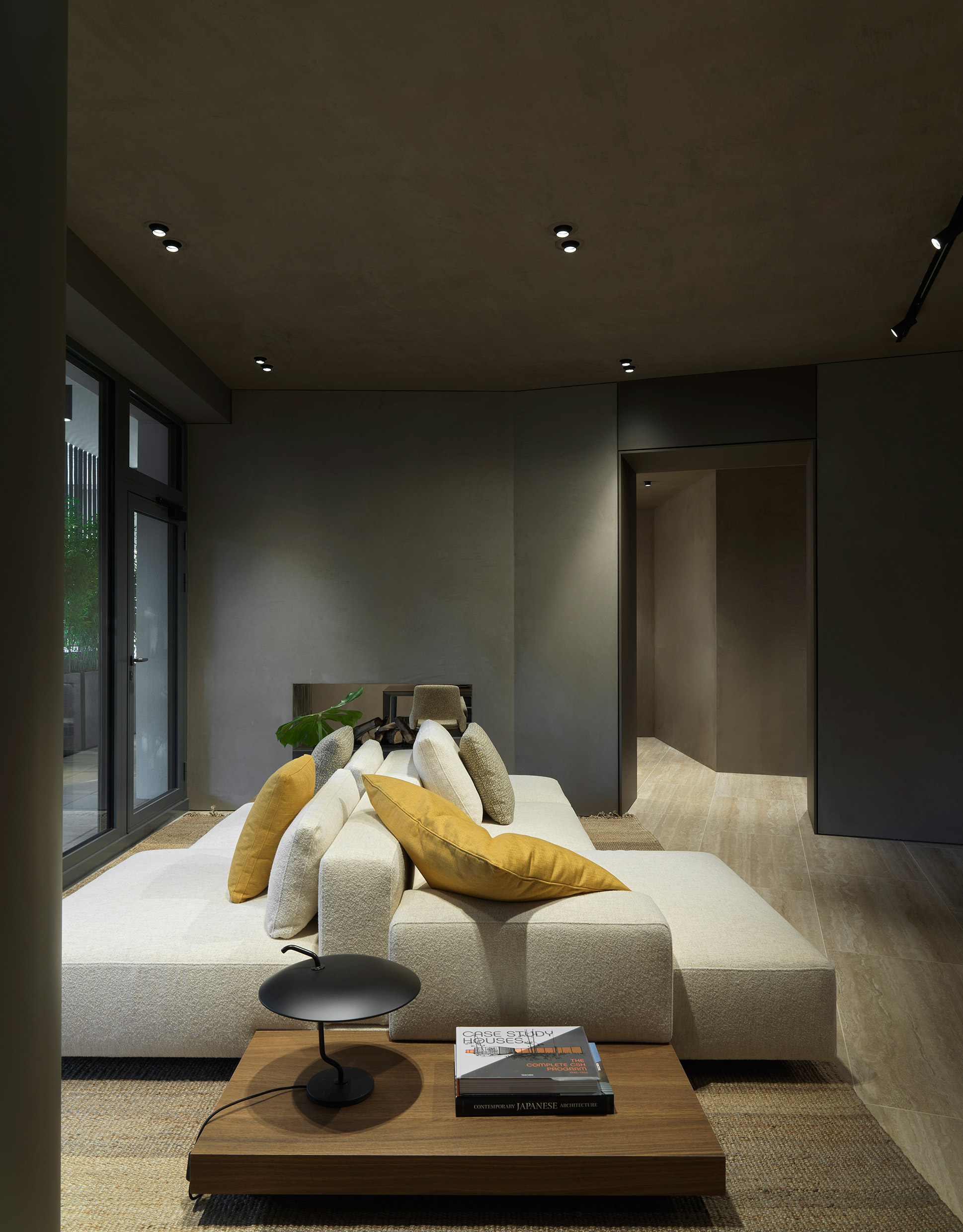 The space continues into a refined living room, made unique by a configuration of the Marteen sofa by Van Duysen. Nature fits harmoniously into the exhibition design, with an outdoor space of almost 60 m2 enriched with green elements that, thanks to the large windows, allow guests to perceive the connection between indoors and outdoors.