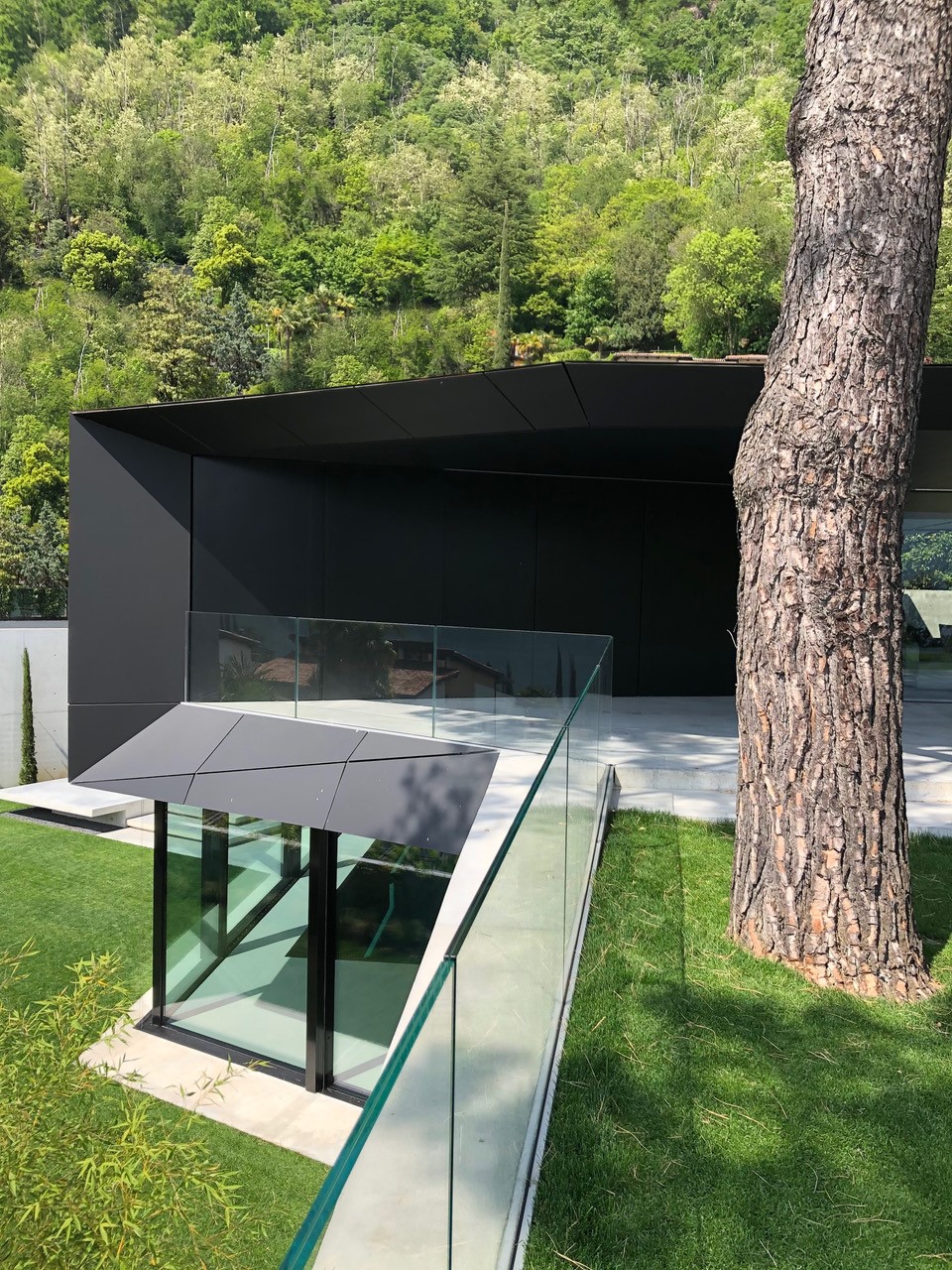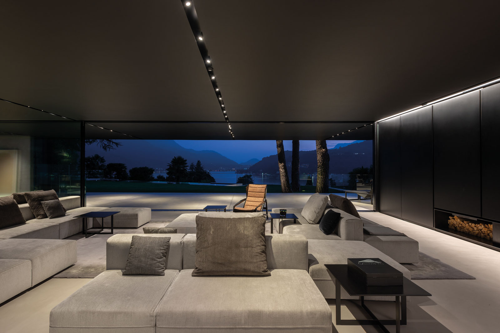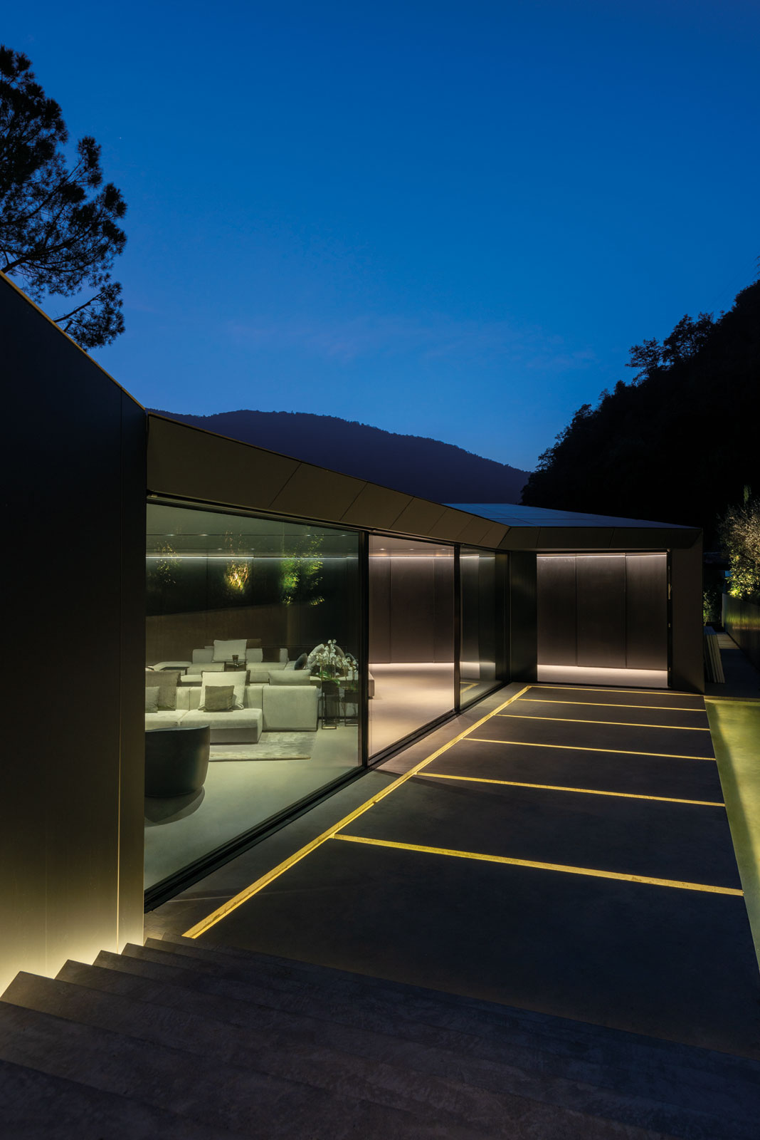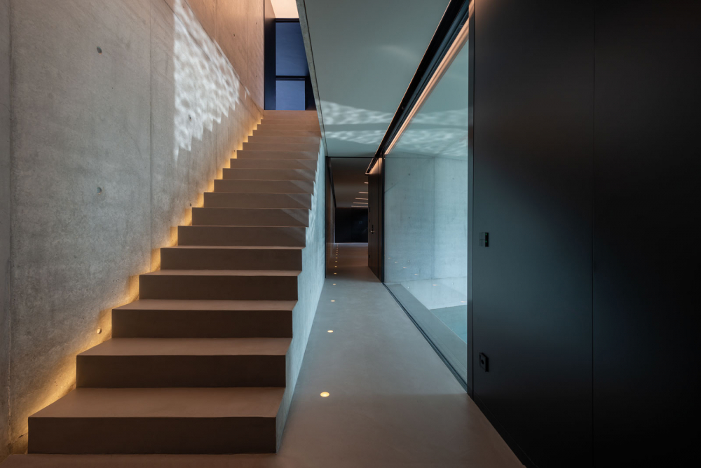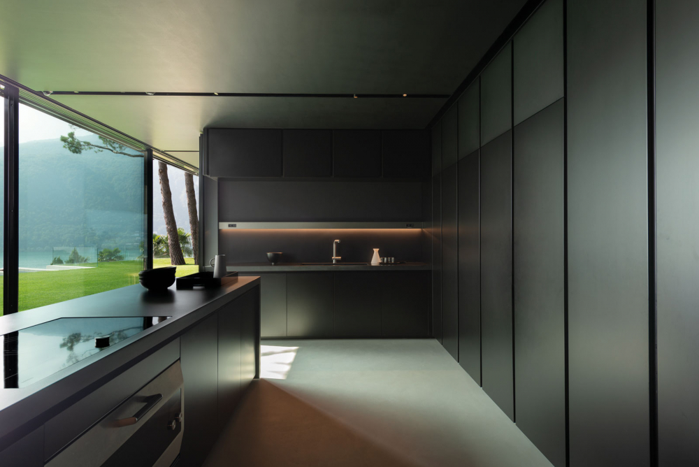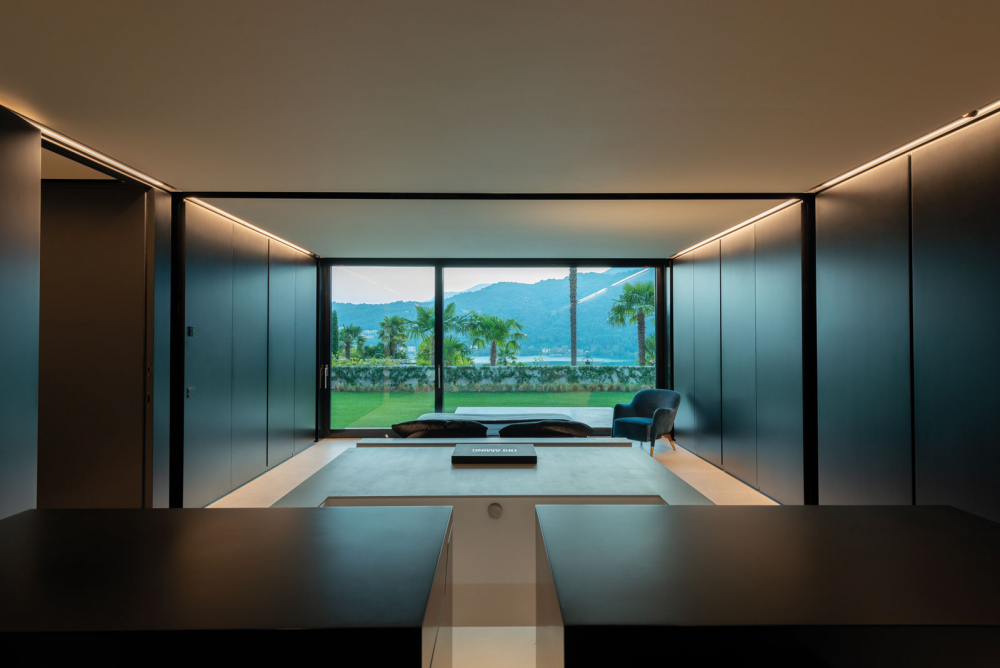 Starting from the beginning of the project, the partnership with the Molteni&C|Dada Contract Division allowed to achieve the goal of abstraction required by the client. Thus, indoor walls are either exposed reinforced concrete or covered with custom made matt black panels. Cement resin floors give indooroutdoor continuity. Ceilings painted with semi-gloss black varnish with a wood effect gives continuity to wall boiserie.