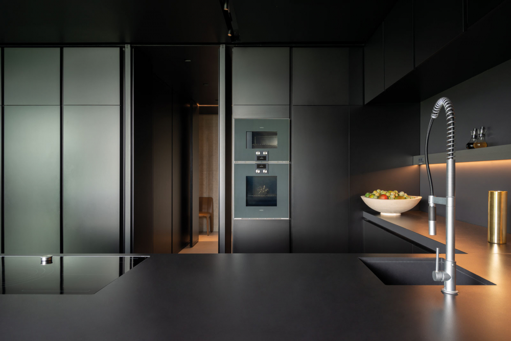 A wide space is dedicated to the kitchen area which hosts a sophisticated Dada kitchen Hi- Line 6 and a custom made black linear table designed by Stealth architect himself.