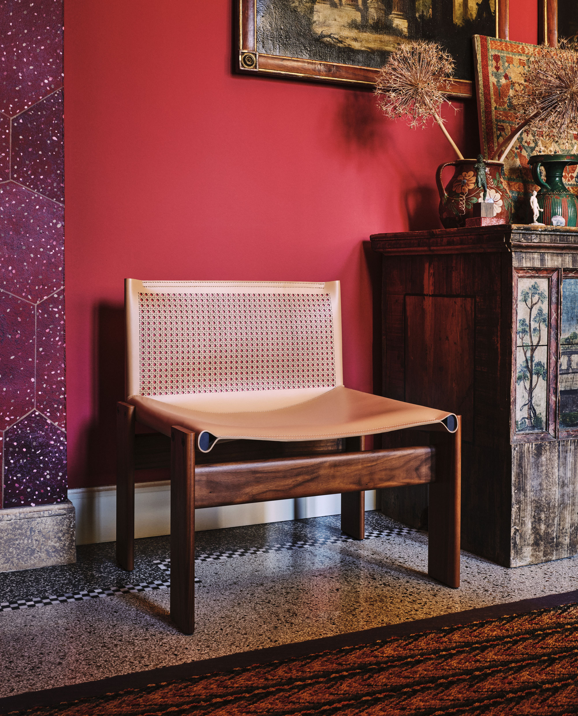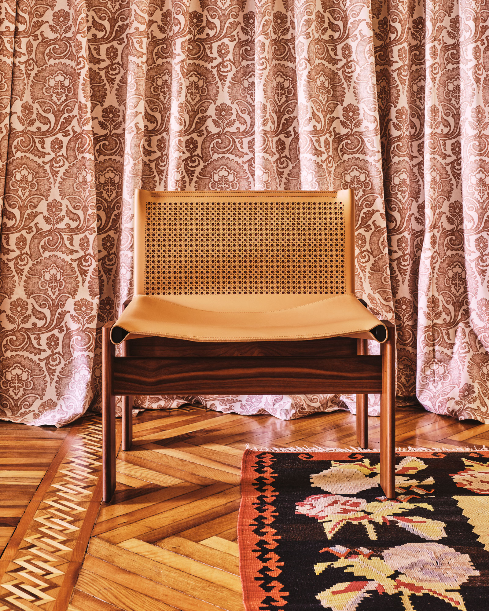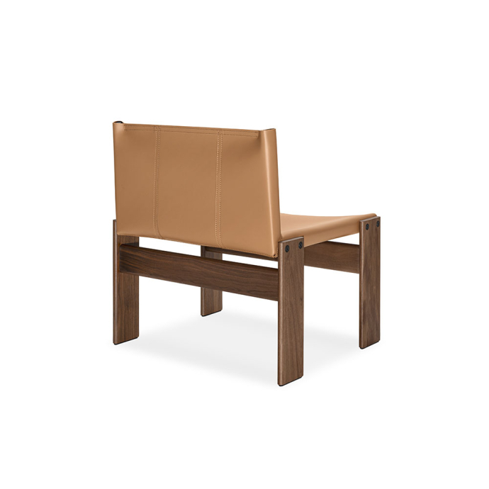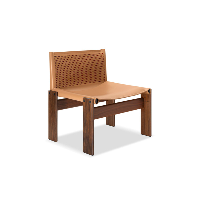 Cabanaとのコラボレーションによる限定モデルのMonkアームチェア。モダニズムデザインに独特の華やぎを添えます。アメリカンウォールナットのフレームが支えるのは、藤編みからインスピレーションを得てCabanaがデザインしたレーザーカットモチーフが特徴的なハイドレザー製バックレスト。