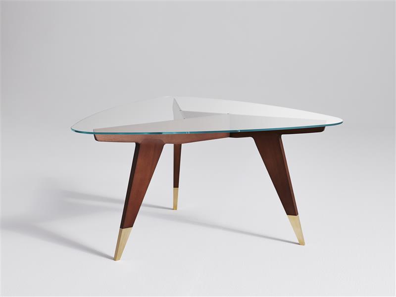 È un tavolino in legno massello di palissandro con piedi in ottone satinato e piano triangolare in vetro trasparente extrachiaro. Fu disegnato negli anni ’50 per l’azienda M. Singer&Sons, una delle più importanti di New York, come parte di una collezione destinata al mercato americano.