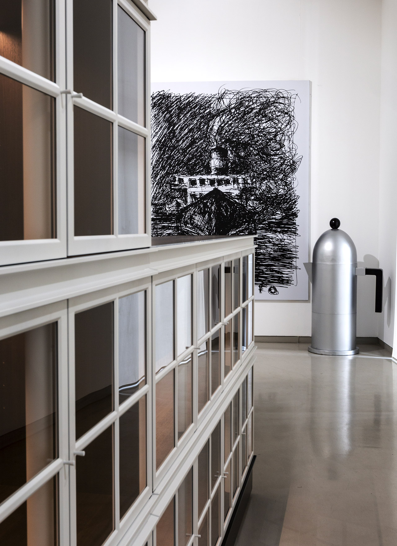 The first space introduces the link between painted images, object reality and architecture that animates the whole exhibition: since the architect/designer’s drawings displayed on the walls, the furniture, tools and projects on show have become three-dimensional – from the Teatro del Mondo (1979) to the Milano chair (Molteni&C,1987), from Cabina dell’Elba (Molteni&C, 1980 and Bruno Longoni Atelier d’Arredamento, 1982) to the Percolator coffee pot (Alessi, 1979).