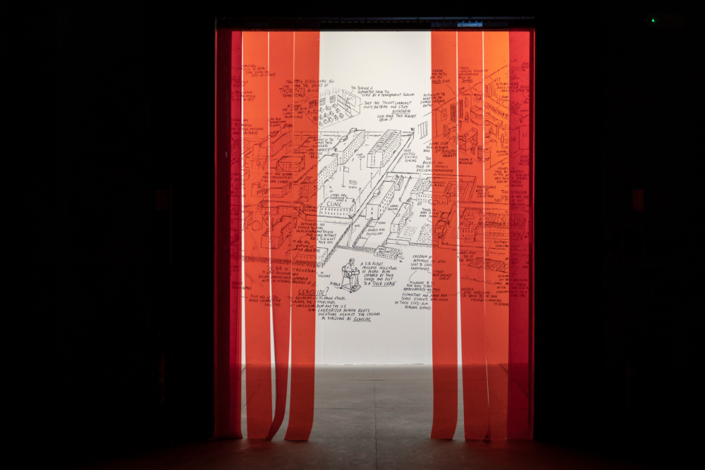 Working between film and intricately carved graphite panels, we are confronted with the inescapable consequences of the materials we use, and the structures these perpetuate, holding architectural practice to account for its inherent and ongoing colonialism. Similarly, an installation by the Office for Political Innovation traces how a predilection for “shininess” for the self-cleaning facades of New York’s Hudson Yards has had a catastrophic societal impact upon the communities around the Xholobeni titanium mine in South Africa, forcing us to acknowledge the destructive impacts that the old ways of working, which have previously been celebrated in the Biennale, have upon the Global South.