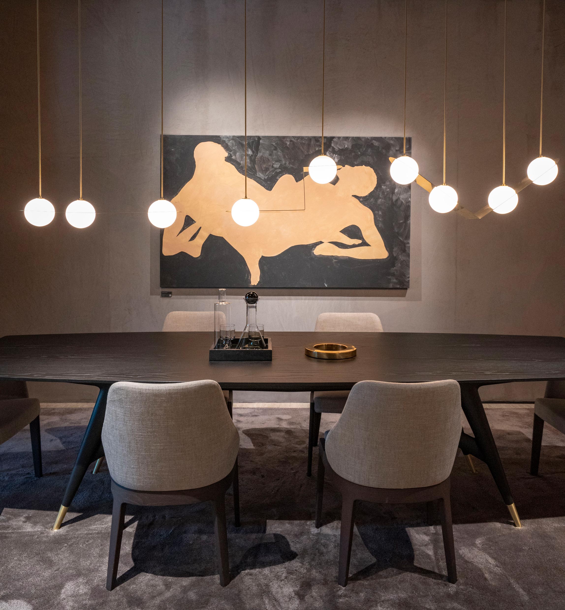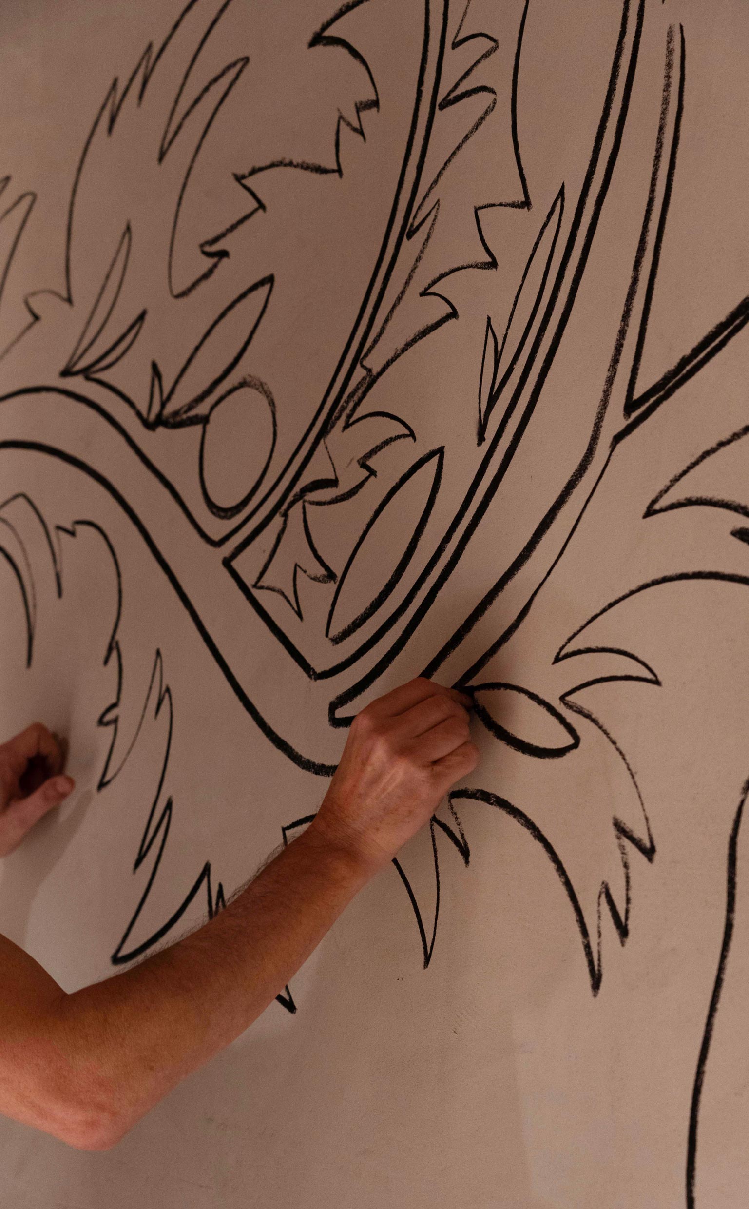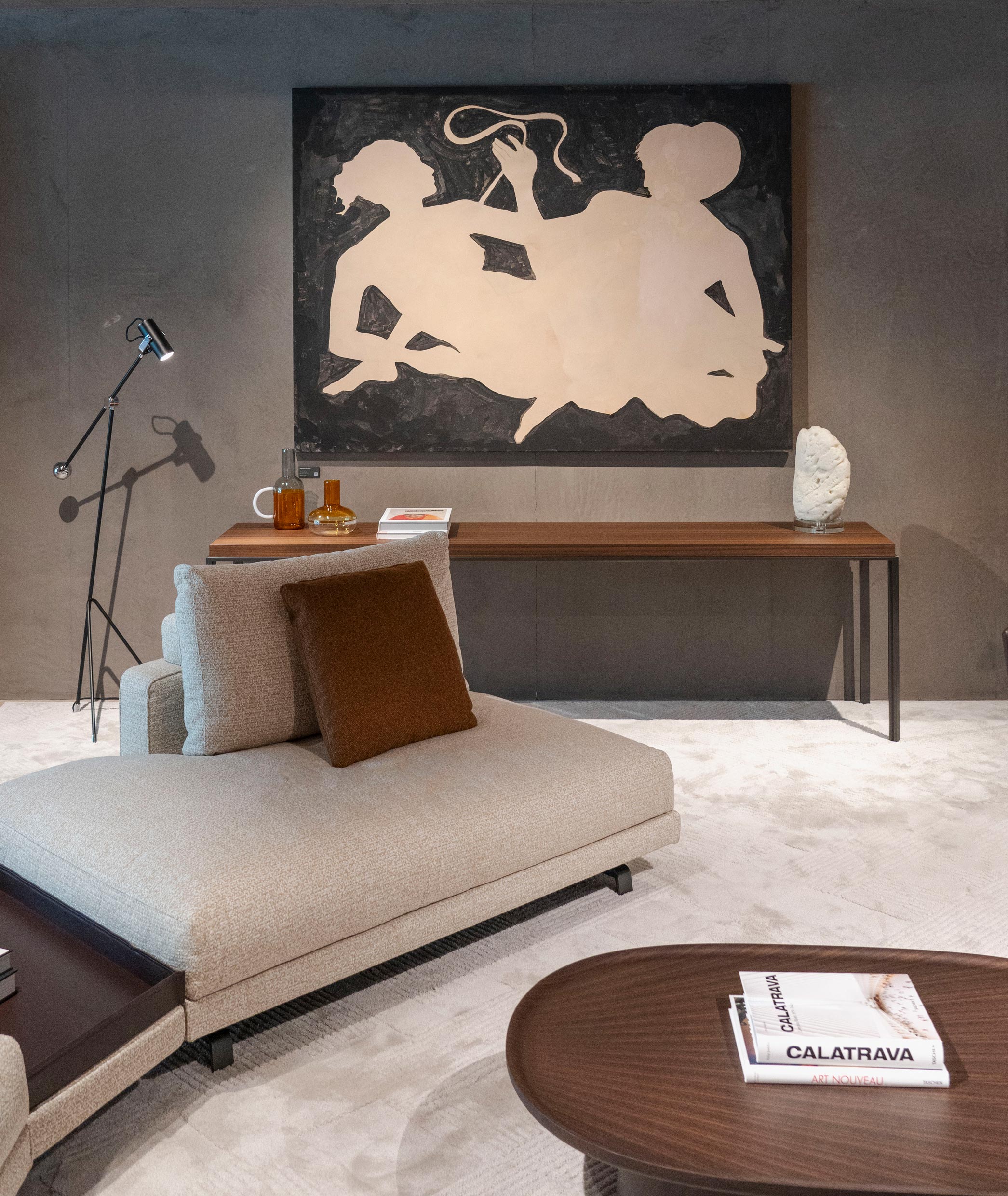 El director creativo Vincent Van Duysen reconoció la sinergia entre la obra de Ruspoli y las inspiraciones históricas de la Domus Romana de la 2023 Collection. Esto dio lugar a una colaboración para nuestra instalación en el Salone del Mobile: un fresco al carbón que adornaba las paredes de la sede de Molteni&C en Giussano (Italia), mezclando figuras clásicas con elementos naturales y acuáticos.