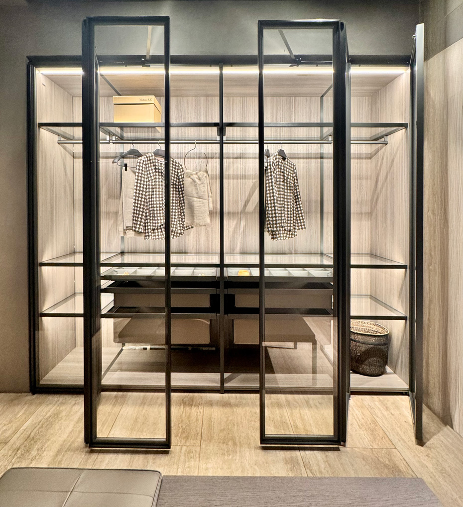 Pewter and transparent Glass with Silver Cembran Melamine LED on every shelf