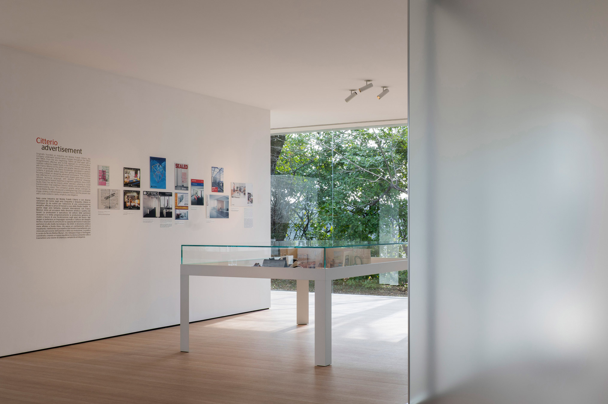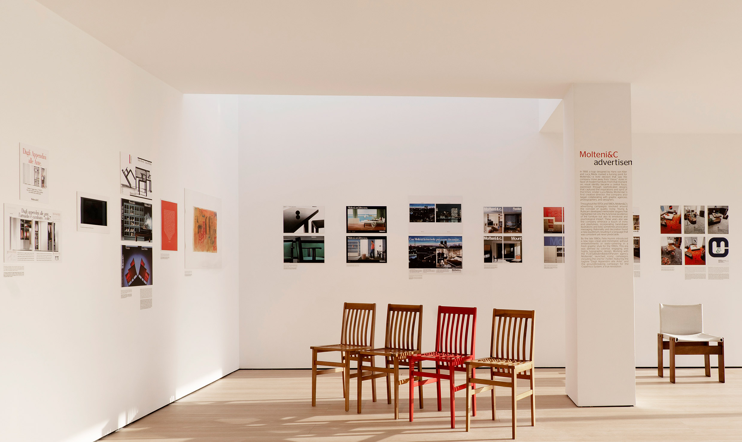 The exhibition features a wealth of historical photographs, advertisements, catalogues, and brochures that trace the evolution of the Group’s graphic design and communication. Central to the display are iconic works by celebrated photographers such as Gabriele Basilico, Luigi Ghirri, and Mario Carrieri, whose imagery has captured the spirit of the brand. Additionally, notable advertising campaigns like “From Hangers to Doors” (Dagli Appendini alle Ante) and “Dada hid the kitchen cabinet doors. Guess where” (Dada ha nascosto le ante della cucina. Indovinate dove) are showcased, highlighting how Molteni Group’s marketing efforts have contributed to its success. The exhibition also focuses on the development of logos, from Felix Humm’s work for Molteni&C to Studio Cerri’s design for UniFor, and the visual identity system created by Nicola-Matteo Munari for Molteni Group.