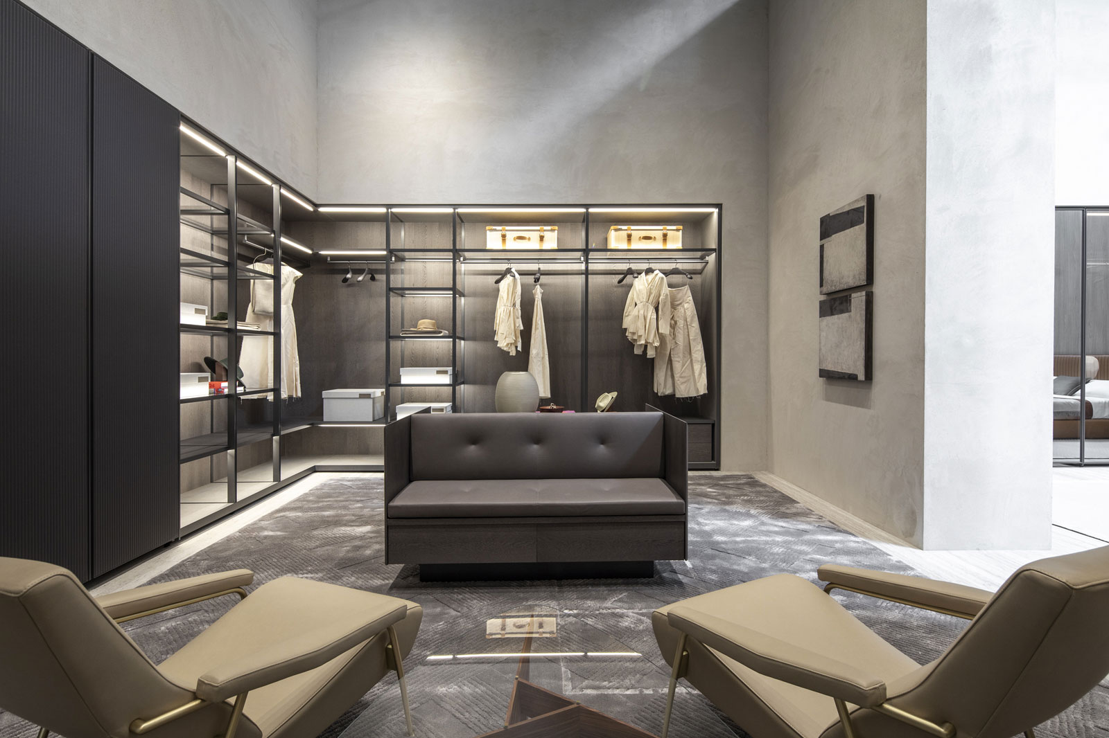 A central living area features the Marteen sofa, Cinnamon armchair by Naoto Fukasawa, and the iconic D.552.2 small table by Gio Ponti. The Gliss Master walk-in wardrobe system, Ovidio bed, and other pieces by Van Duysen complete the store’s bedroom collection, creating a serene and functional sleeping area.