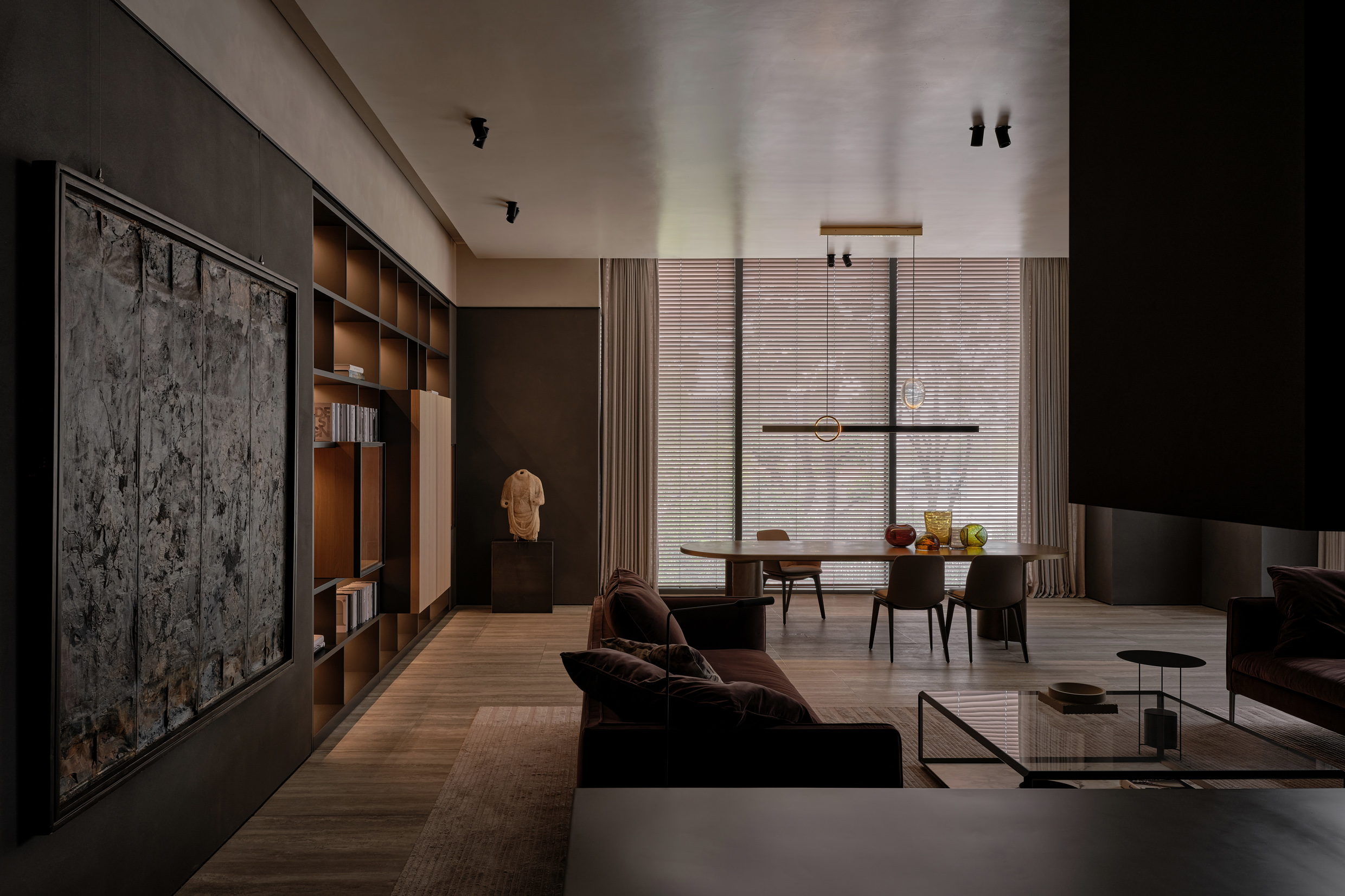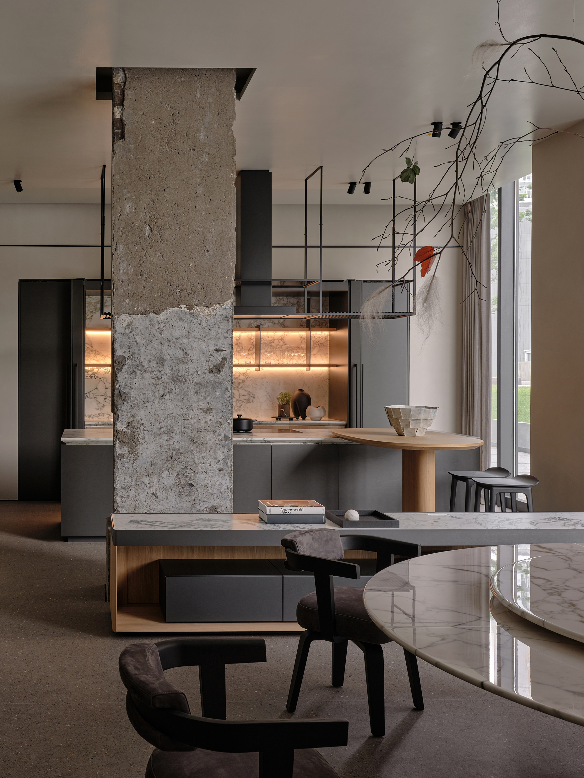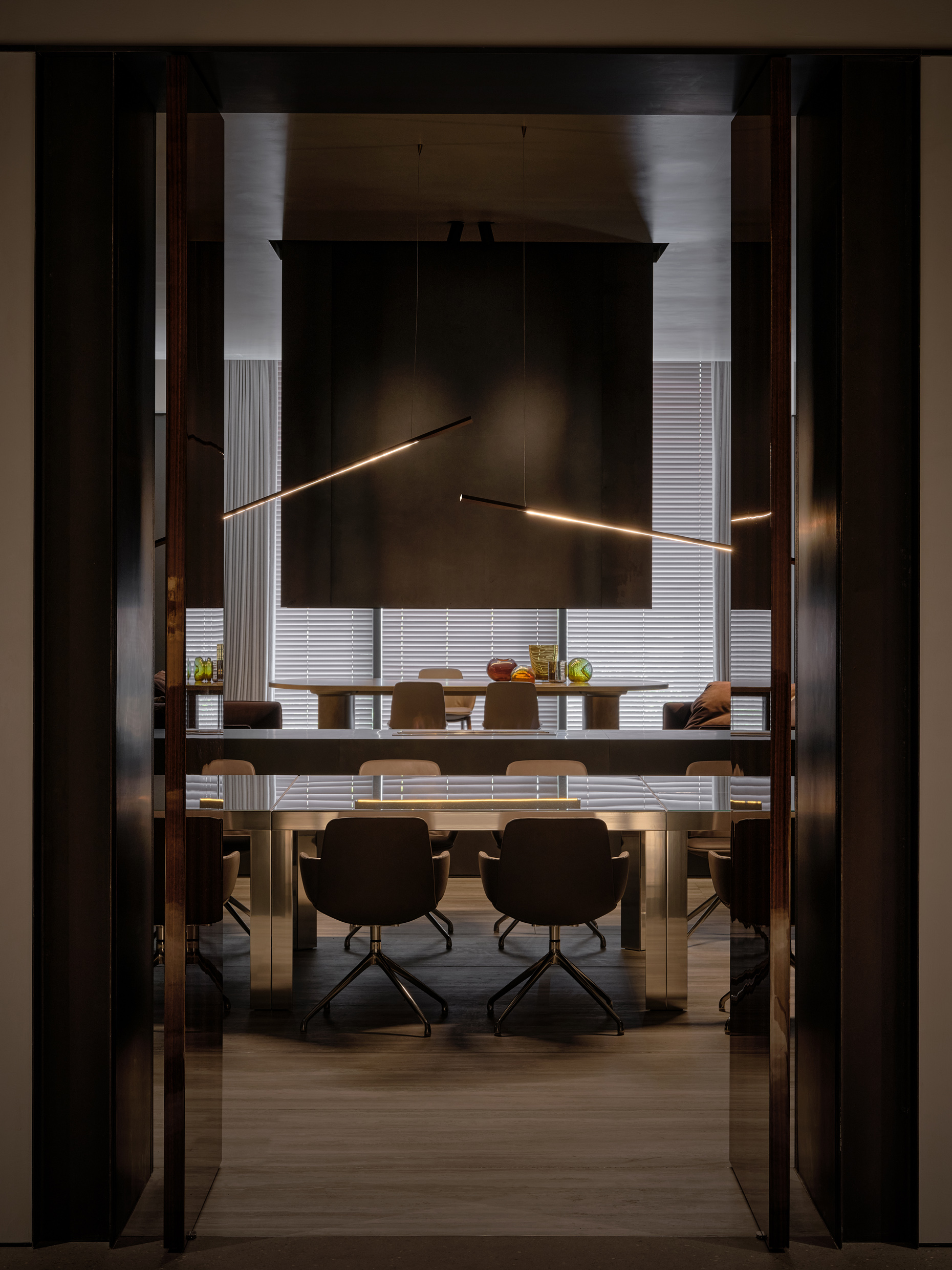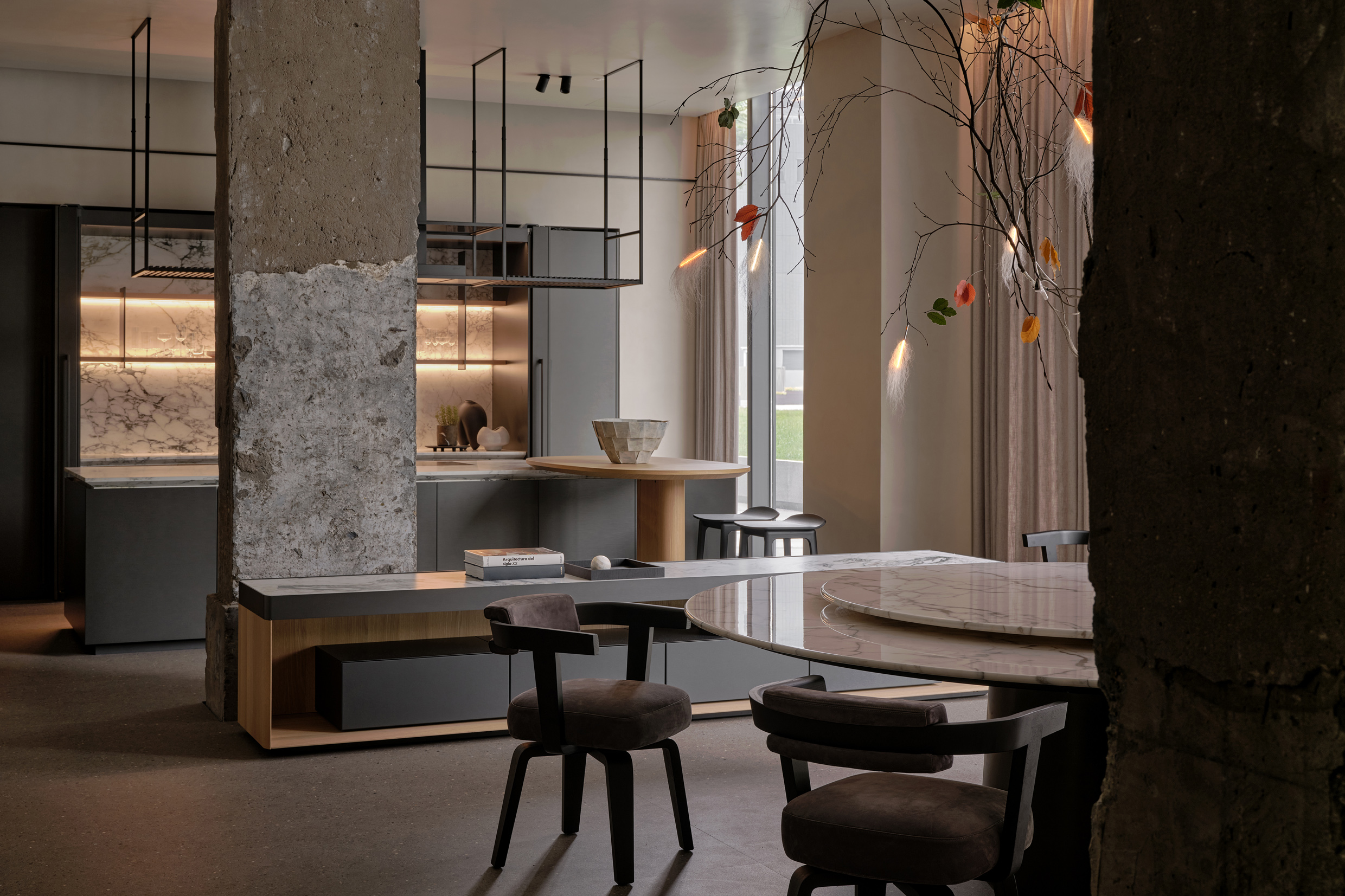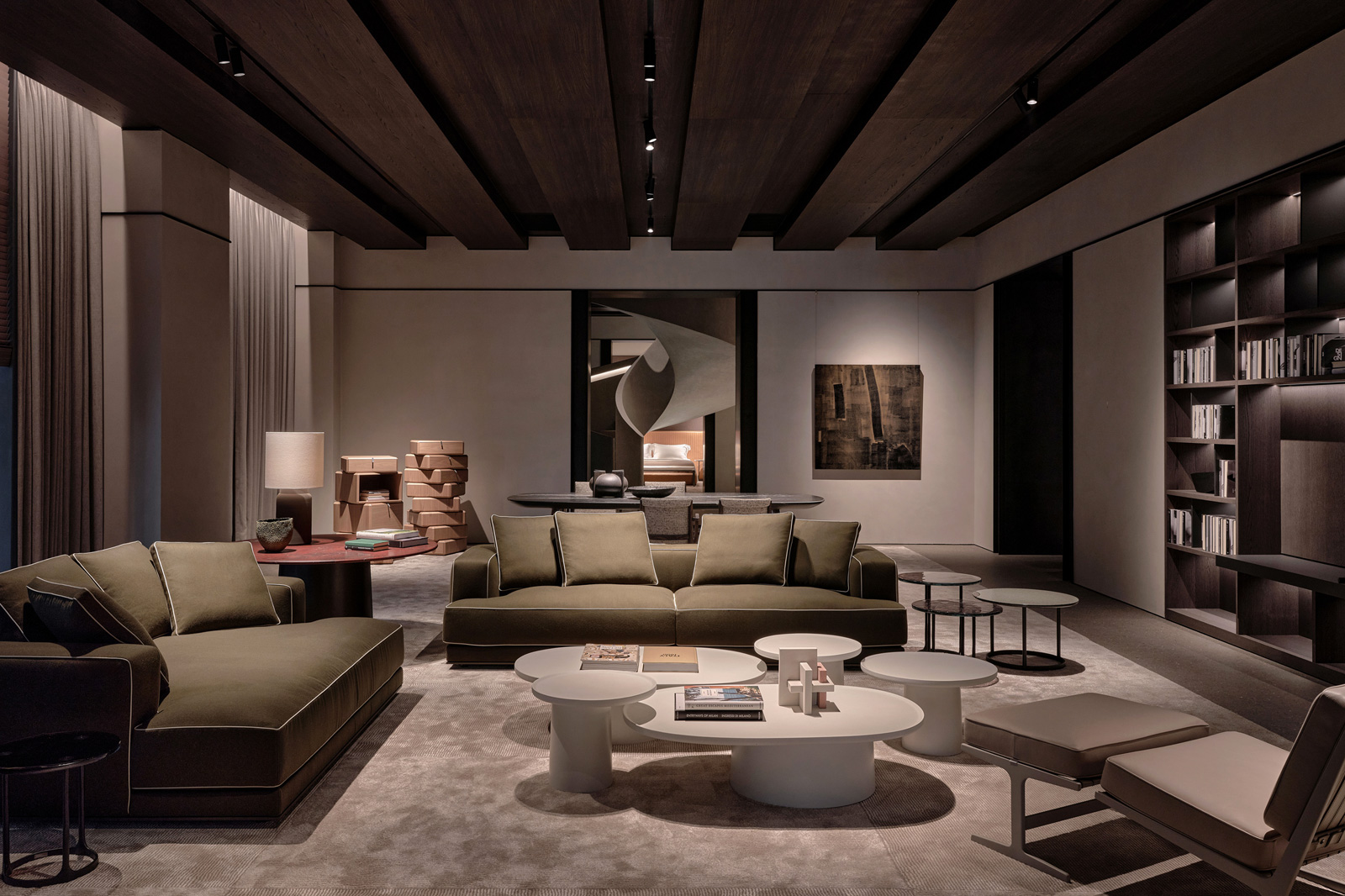 Vincent Van Duysen, Molteni&C’s Creative Director, envisions the store as a palace-like space with a succession of elegantly refined rooms, interconnected by a sculptural staircase and adorned with details that nod to Chinese culture. The design incorporates exposed reinforced concrete columns, a tribute to the building’s industrial past, seamlessly blended with modern metal accents.
