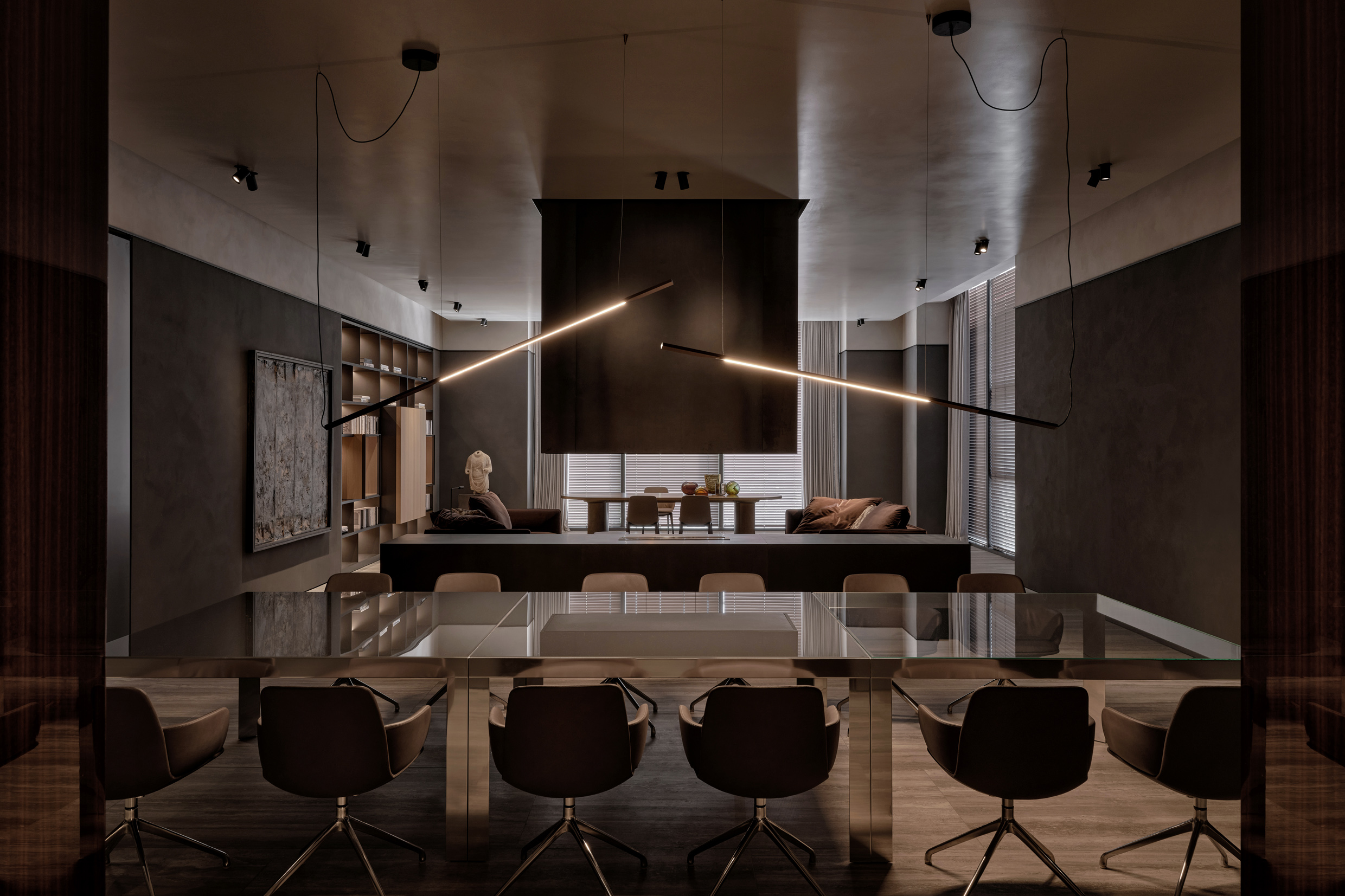 A highlight of the store is the Art Gallery, dedicated to the works of Gio Ponti and the Heritage Collection, set in an open space of concrete and stainless steel. This gallery offers a glimpse into the history of Molteni&C through iconic furniture designs.