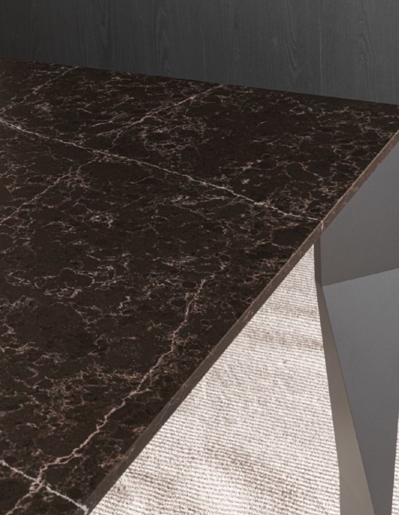 ロドルフォ・ドルドーニがデザインしたダイニングテーブル。滑らかなアルミダイキャストの脚部と重厚な大理石天板がテーブルの美しい形状を際立たせている。