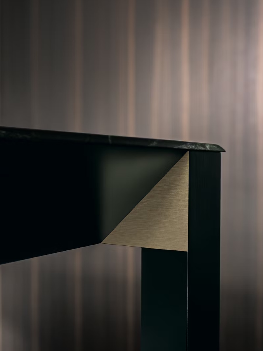 全てのパーツが直角二等辺三角形で構成され、これ以上なくミニマルなデザイン性と 堅牢な強度を持つテーブルに仕上げられている。