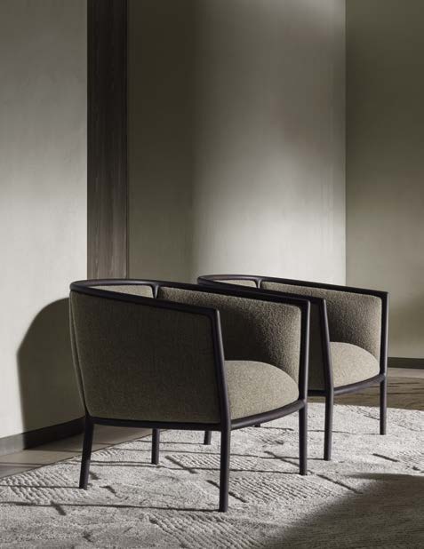 極限まで削り出された木フレームと滑らかな曲面のバックレスト、アームが、 コンパクトながら360°どの角度から見ても美しいフォルムを作り上げているパーソナルソファ。