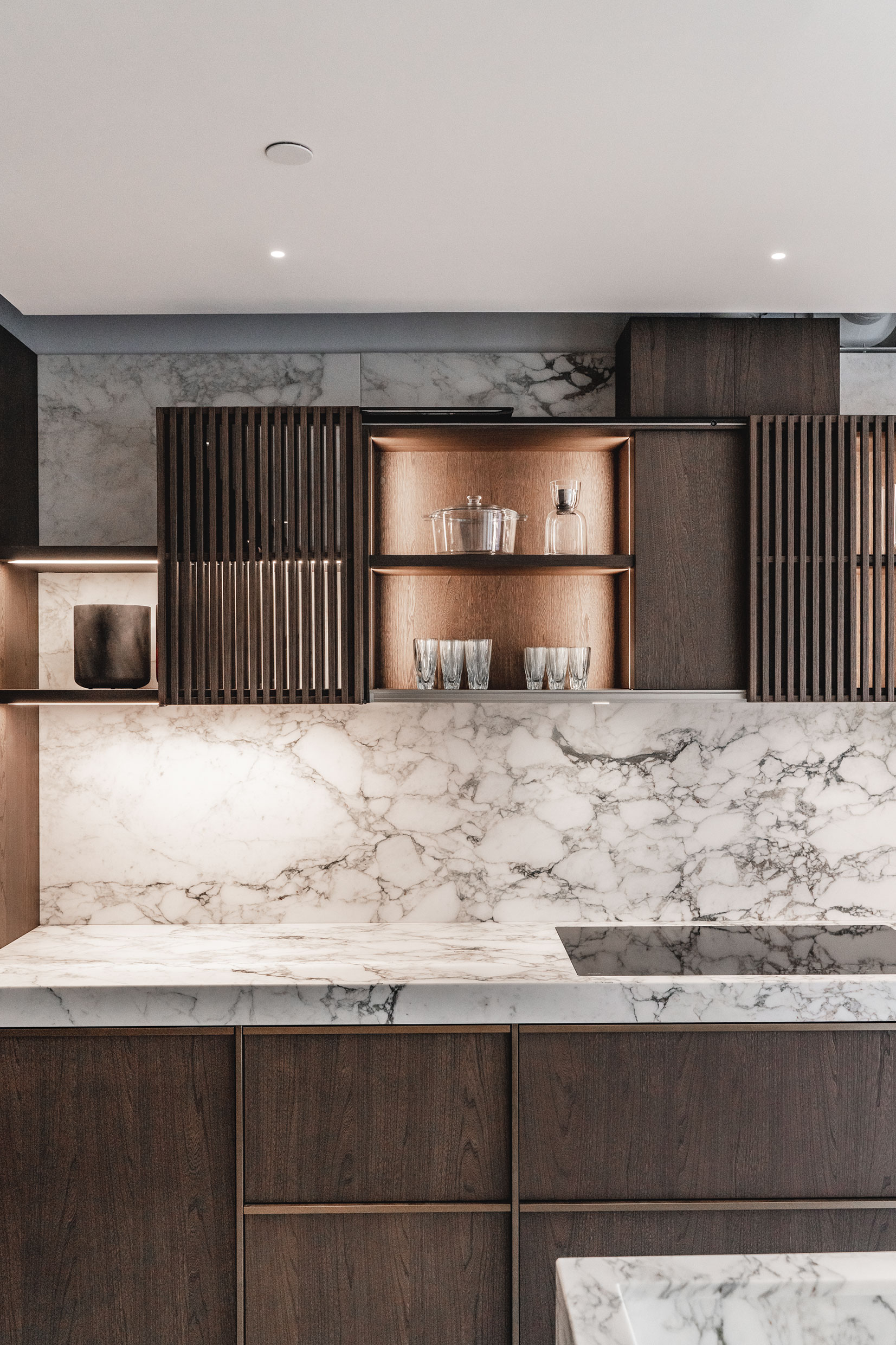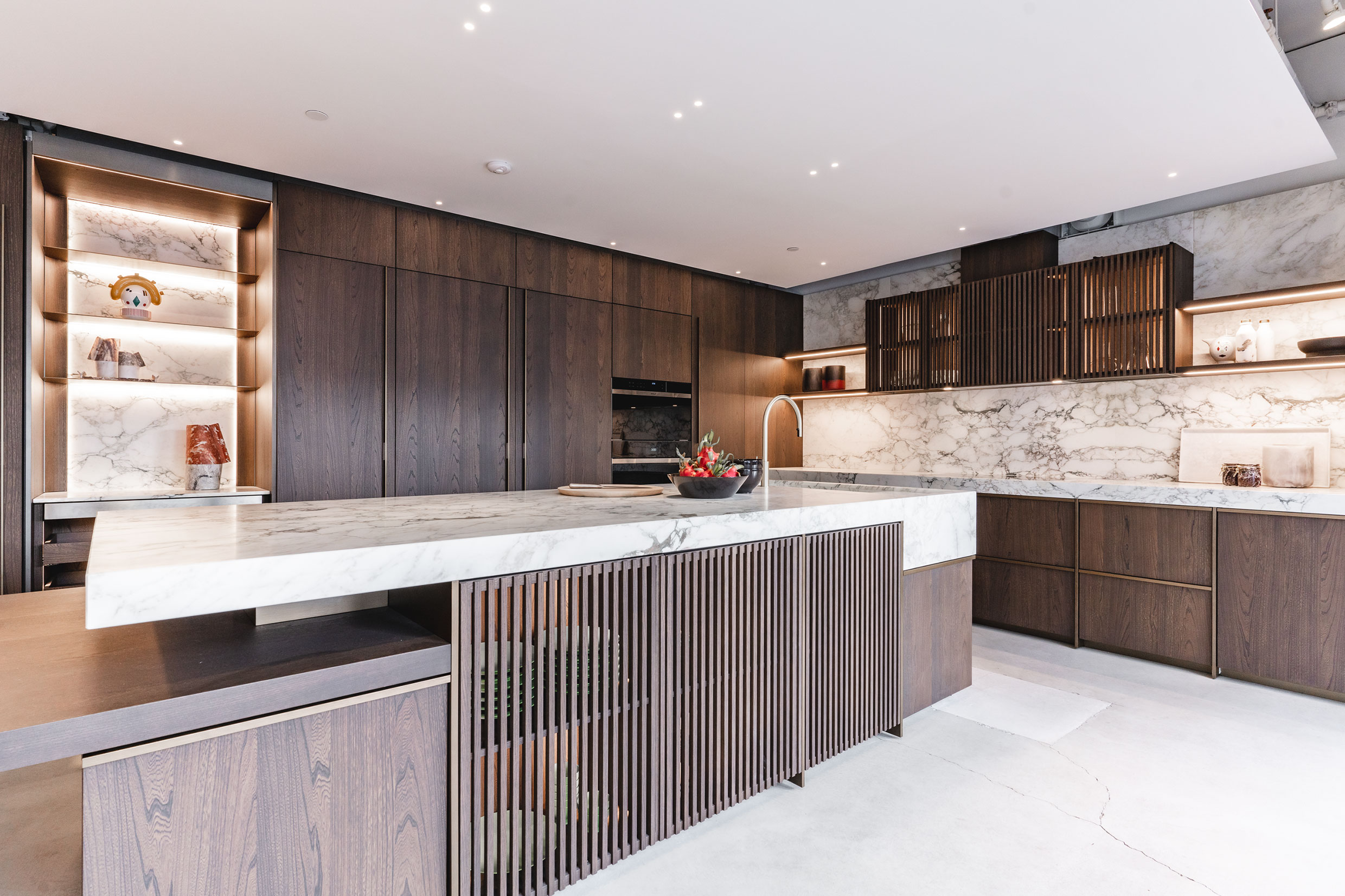The fifth floor welcomes an elegant Intersection Kitchen by Vincent Van Duysen that, as all the Molteni&C Kitchens, boasts the seal Dada Engineered, a seal of innovation that encompasses much more than a word: it reveals and certifies the attention and care that the brand has always placed in kitchen design. The two islands give the space a monolithic and elegant look, thanks to the unique, sculptural and architectural design and the predominance of Black Oak.