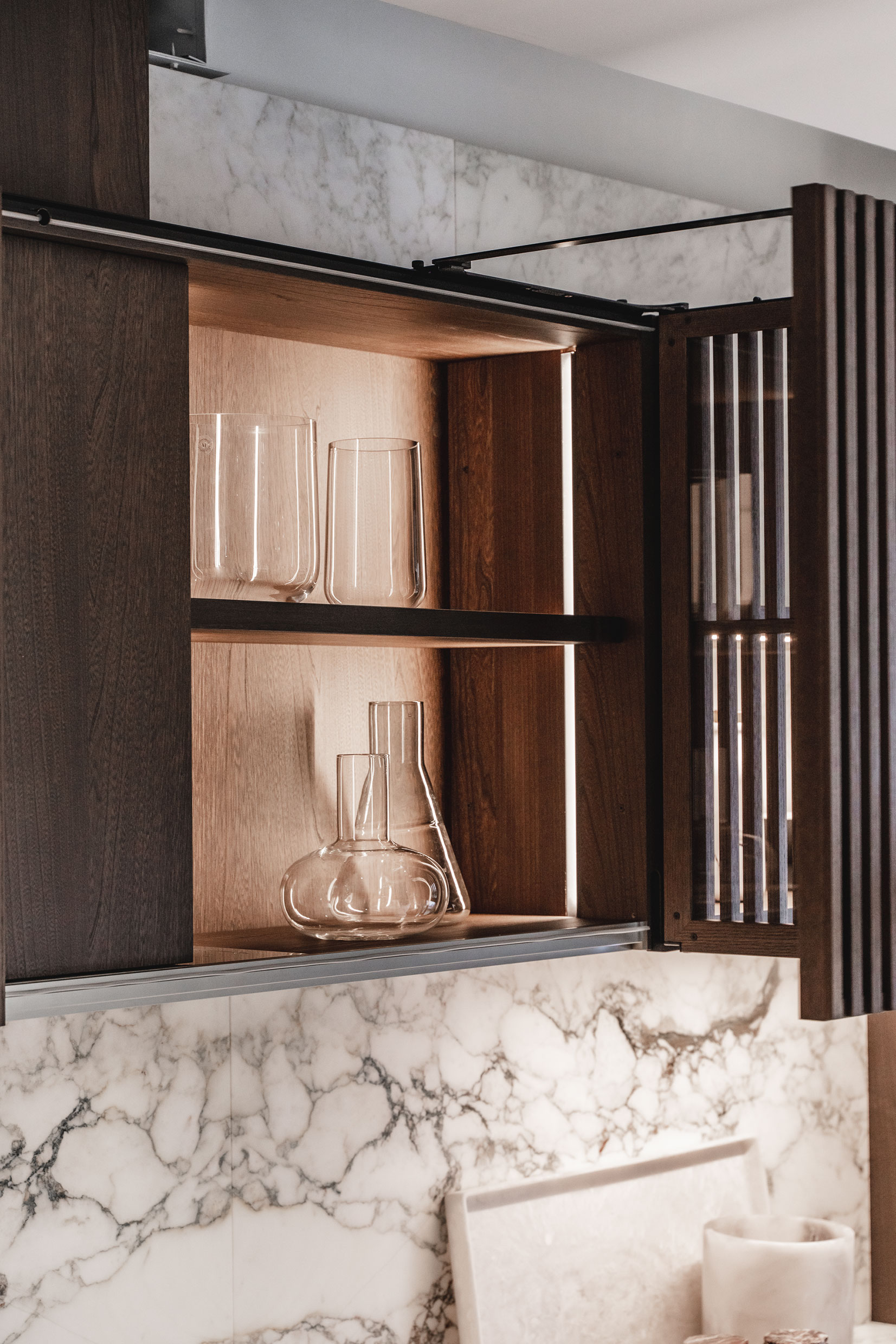 The over 300 sq. m of the space develops at the top level. It is inspired by the architecture of a family mansion. Distinguishing elements of the space include the transparencies created by huge windows, a signature feature of the Belgian designer. Living areas converse with dining areas and open onto a spacious and visually impressive VVD kitchen. The night-time area features pieces of the new Gliss Master collections in various finishes and compositions, such as the Sistema 7 with glass doors and, the Gliss Master island in light chestnut finish and bronze handles and the ivory ecoskin bamboo doors.