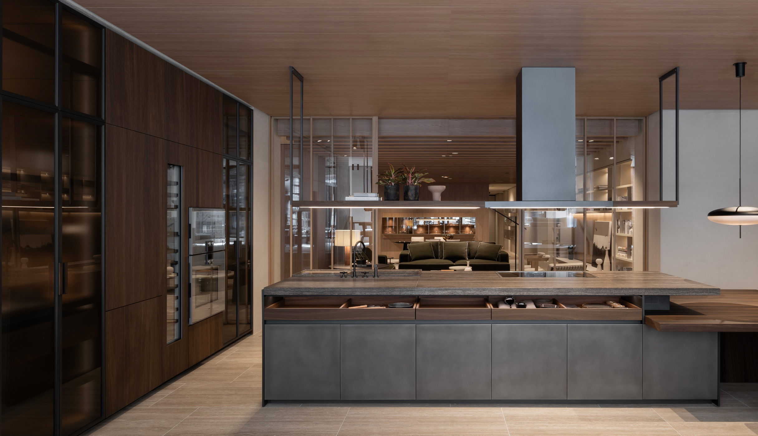 To conclude the tour, a final kitchen area presents Vincent Van Duysen’s Intersection Island with Woody stools by Francesco Meda. Guests are invited to explore the ingenuity behind the Hector modular bookcase system. Notable pieces of furniture such as the Pannacotta coffee table by Ron Gilad, Van Duysen’s Paul sofa and Elain armchair, and Heritage-collection Blevio table seamlessly integrate luxury and hospitality.