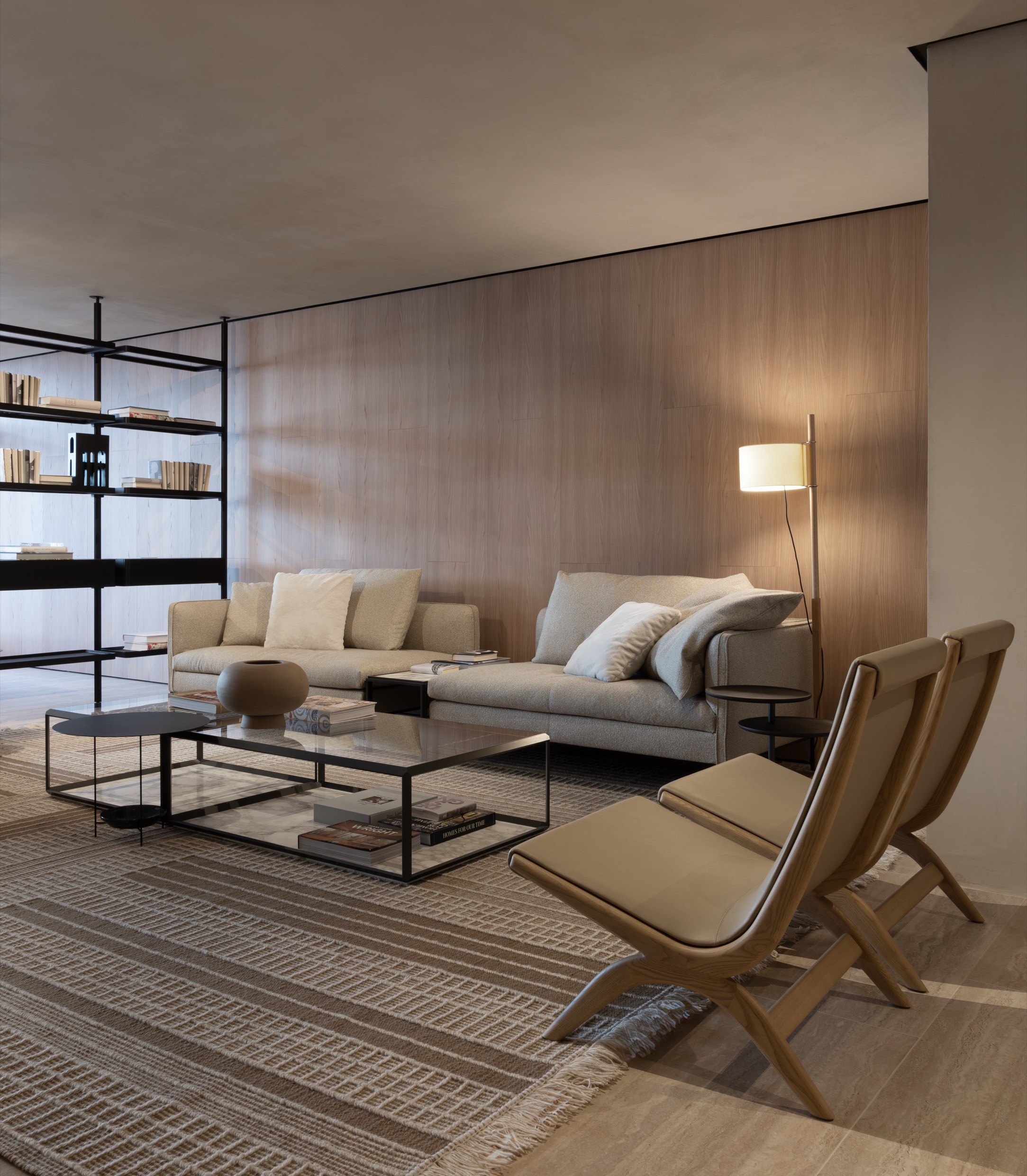 Stepping into the expansive store, guests are greeted by a welcoming dining area dominated by the VVD island. Cherished pieces such as Vincent Van Duysen’s Mateo and Regent tables, and Herzog & de Meuron’s Porta Volta chairs display a contemporary yet cozy interpretation of a modern-day gathering space. Underfoot, Marta Ferri’s Vibrazioni carpet invites visitors further into the experience.