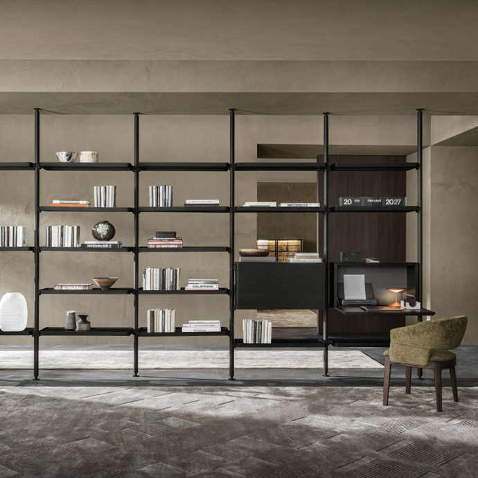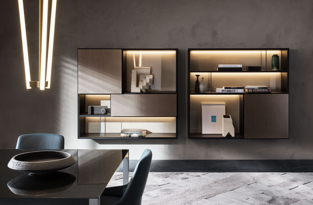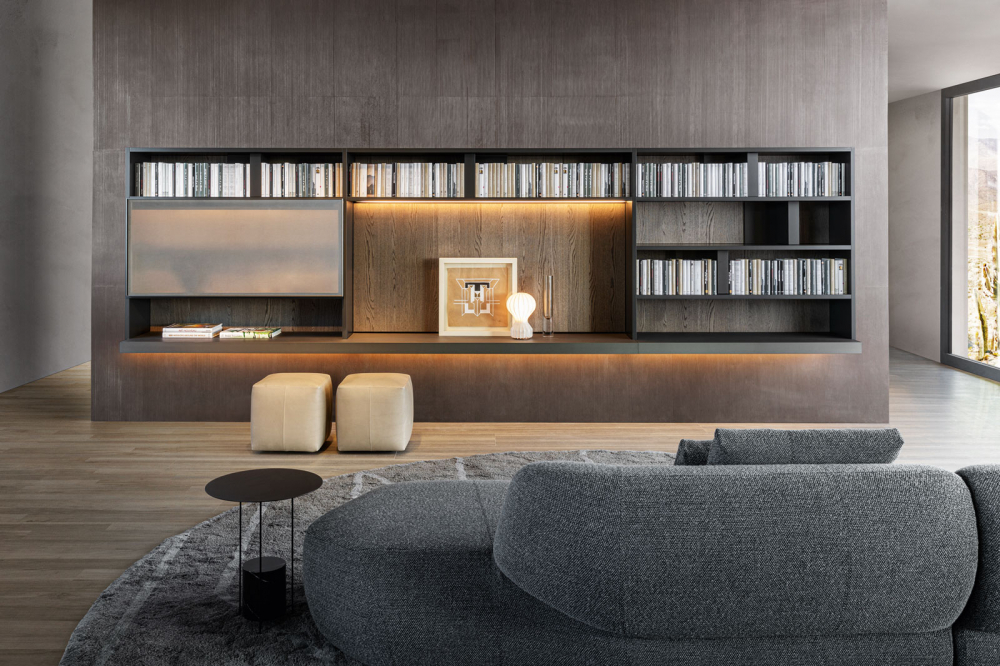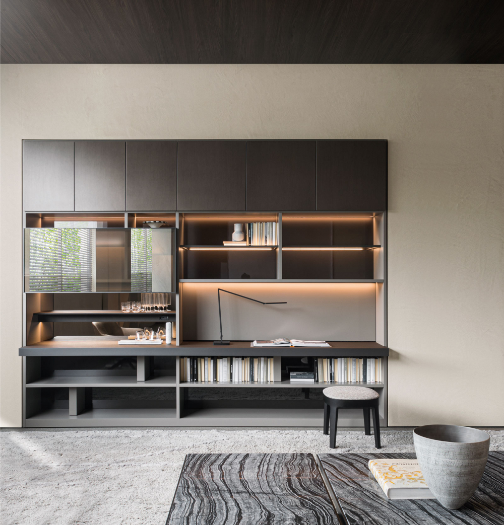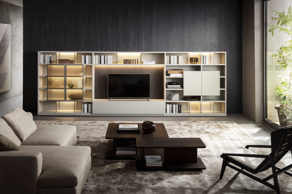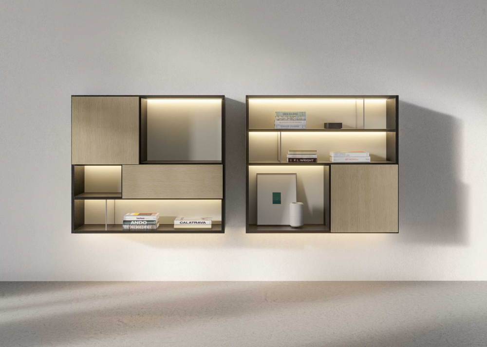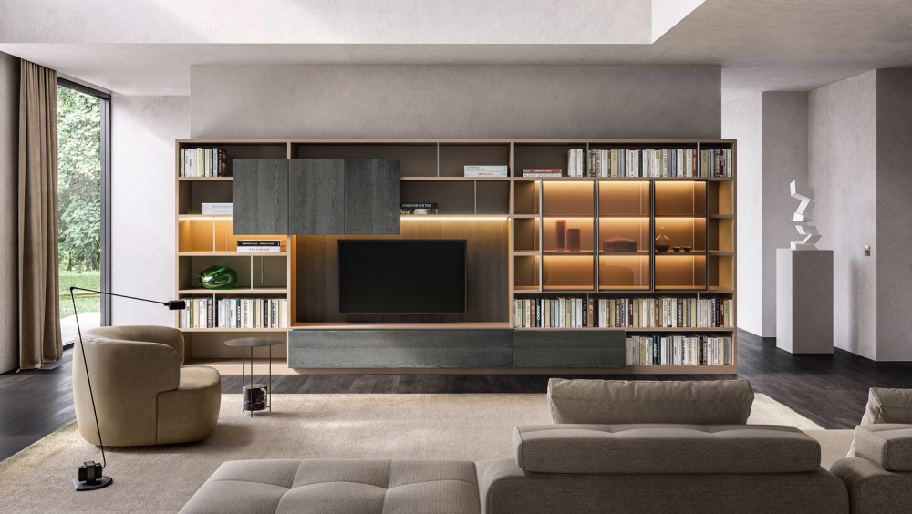 Bookcases, containers, cupboards, display cabinets, TV cabinets, smart working stations, multifunctional walls.