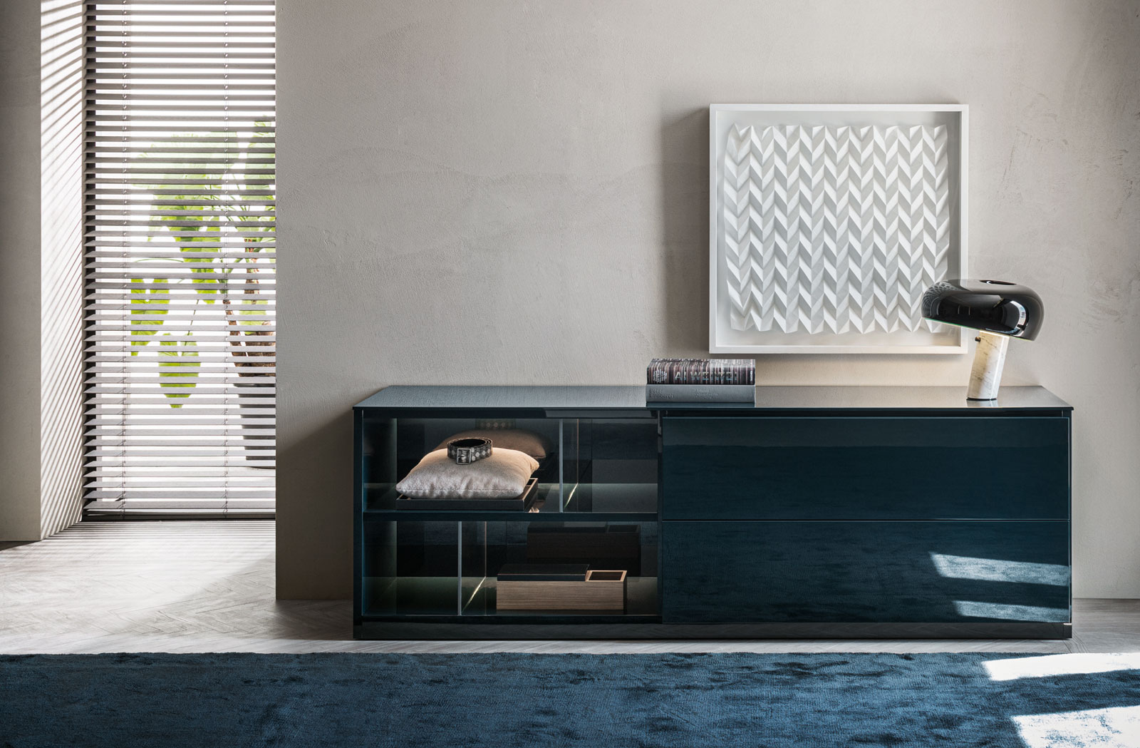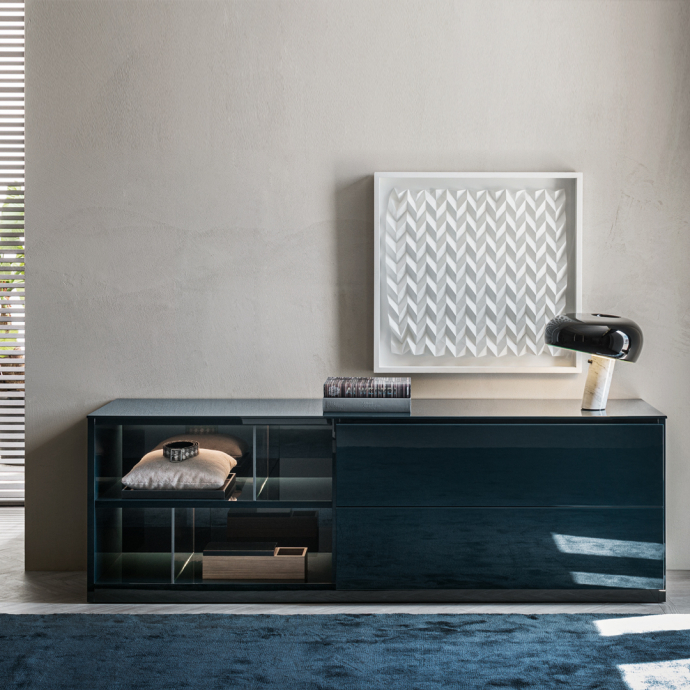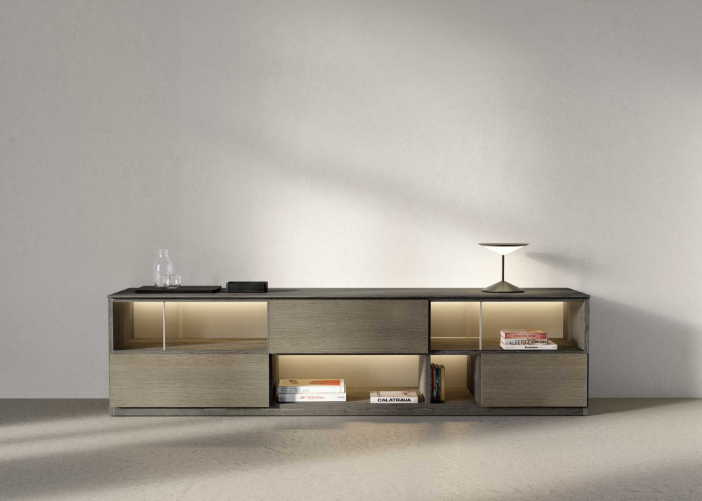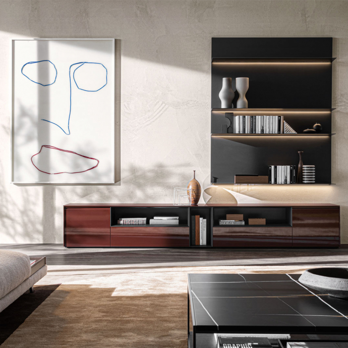 505 is a system with load-bearing lateral pieces, which develops as a series of modular furnishings with a wide range of options: 7 widths, 3 depths and 9 heights, conceived as a bookcase, TV system or multipurpose cabinet. The finishes, matt or glossy lacquered or woods and glasses can be mixed and matched to obtain different solutions in order to answer to the modern needs.