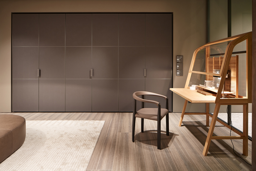 The over 700 square-metre stand designed by Vincent Van Duysen is inspired by large residential architecture where living and dining areas are interconnected. Each area is defined by natural, sophisticated materials, like glass, oxidized wood and raw metal, and the alternation of sand and greys with flourishes of bright green.