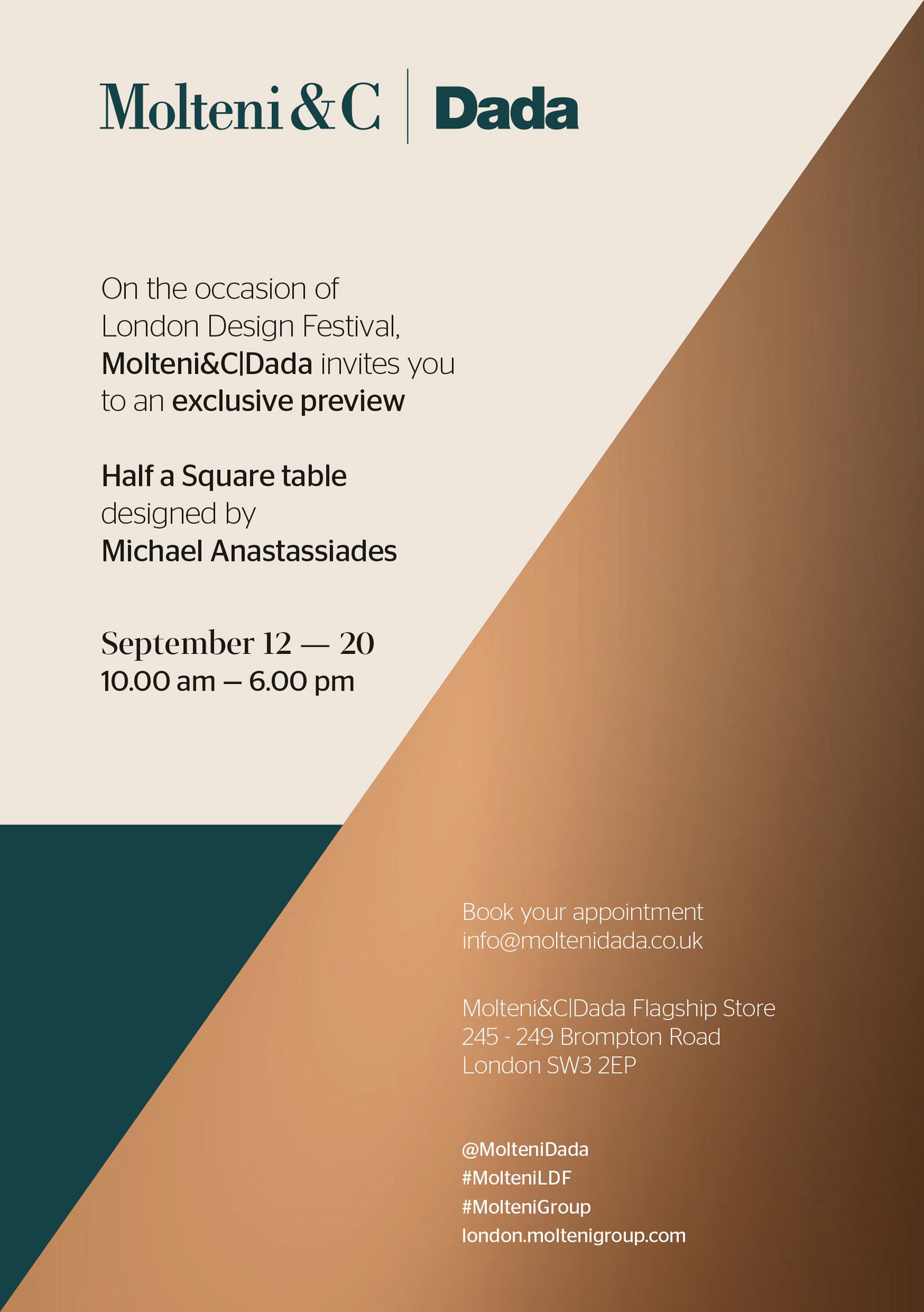 On the occasion of the 2020 London Design Festival, Molteni&C|Dada presents an exclusive preview of the new Half a Square table, part of the 2020 collection, at the Molteni&C|Dada Flagship Store on Brompton Road.