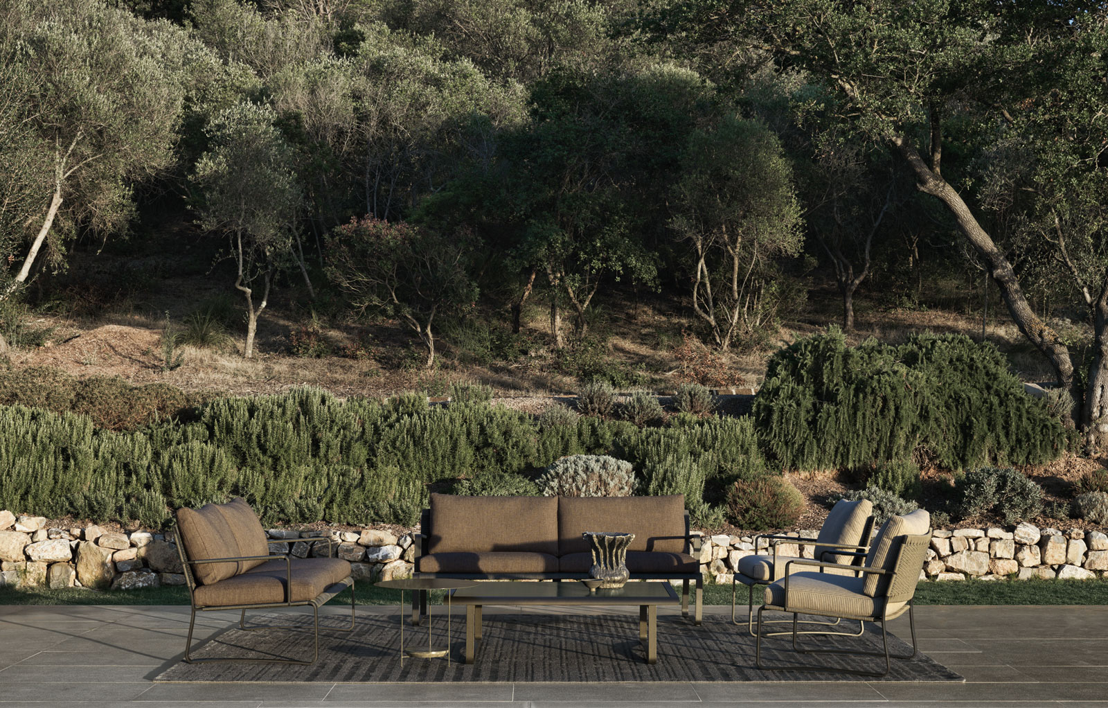 In its outdoor guise, Panna Cotta features a stainless-steel frame with a perforated top, supporting a base in Lava Stone. The vitreous inserts of the Etna lava stone, used for the oven-baked enamelling of the surfaces, come from the crushing of recycled glass from TV and PC monitors. The coffee table is available in anthracite, olive green and desert yellow is available in two rounded tops.
