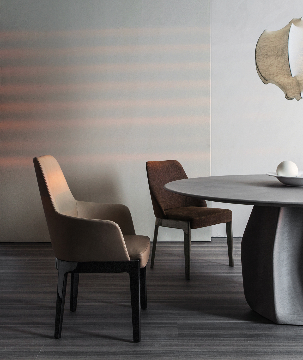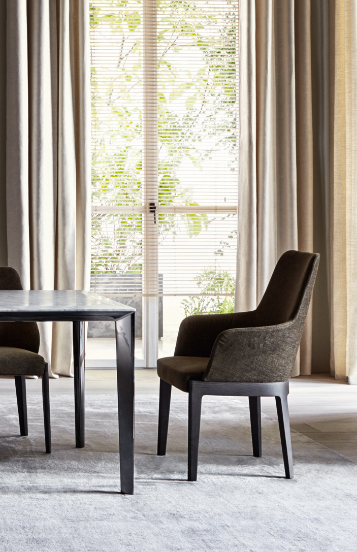 Like the armchair from the same range, the Chelsea chair summarizes the essence of contemporary design and the memory of tradition. It is an ideal tendency towards the future which brings with it the knowledge. Chelsea is a series of chairs in varied styles, particularly well-suited to dining rooms where the pleasure of good food is accompanied by the pleasure of cultured, cosmopolitan conversation. With a frame of simple design but elegant proportions, it comes in three backrest options: two with arms, one without. Master craftsmanship values are expressed by the processing of the highest quality raw materials, from wood, fabric and leather. The details are made with care and passion that ensure the appeal of these extremely versatile seats.